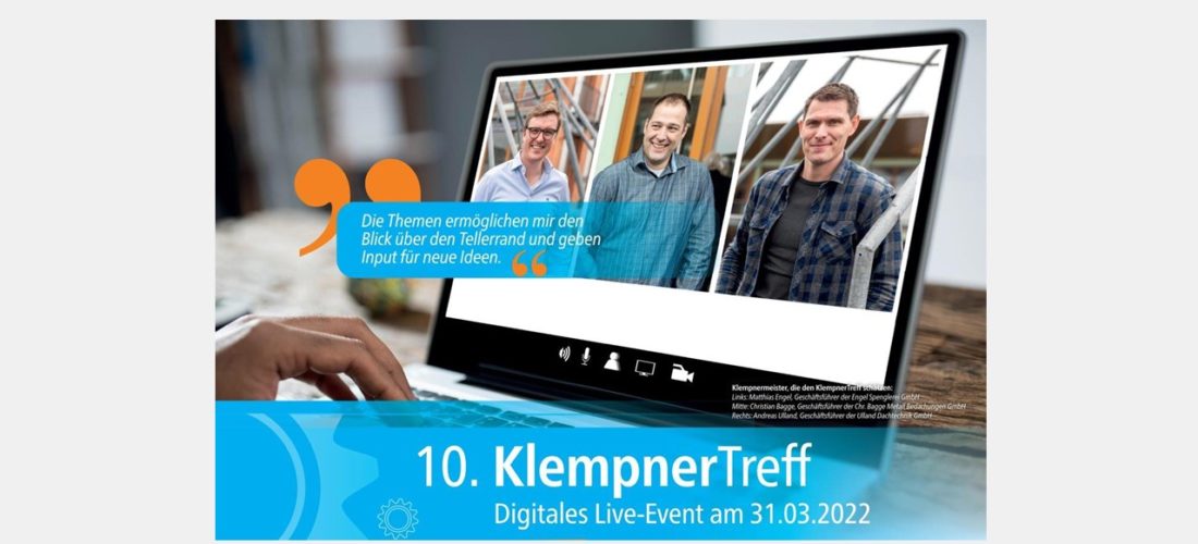 Am 31. März 2022 fand der 10. KlempnerTreff als Online-Veranstaltung erfolgreich statt. Die zahlreichen Referenten hatten einiges zu bieten, um Sie auf den neusten Stand der Technik zu bringen.